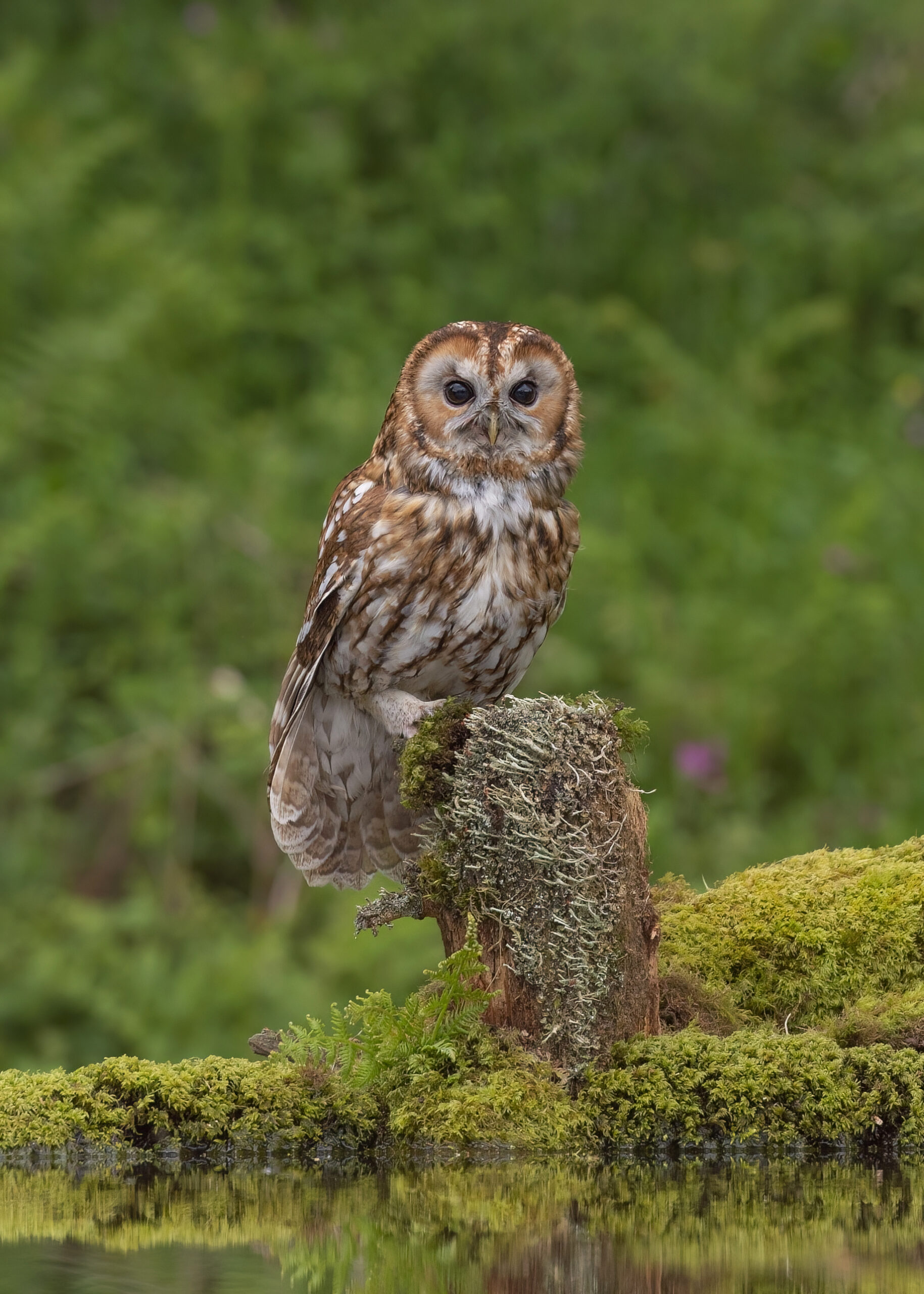 Tawny owl resting on a mossy tree stump in front of shallow water